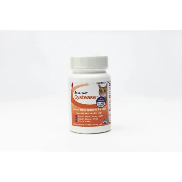 Feliway Cystease contains N-acetyl glucosamine and hyaluronic acid which help support the bladder lining and L-tryptophan is known to have a calming effect in cats.Â